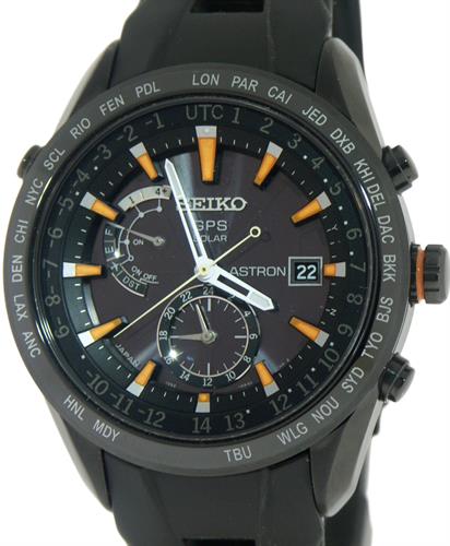 Seiko Astron SAST025. The World`s First GPS Solar Watch. Understands all the 39 official time zones. Accurate time, anywhere on earth. Convenient, simple and elegant. Seiko Cal. 7X52. Black PVD stainless steel case. Ceramic bezel. Black dial with orange luminous markers. Black rubber band.
