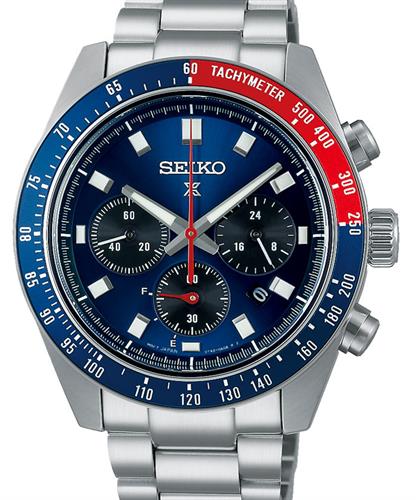 Seiko Prospex Solar Speedtimer Chronograph watch model or US model SSC913. Stainless steel case and bracelet in a new larger 41.5mm size. Blue dial with black sub-dials. Watch functions include chronograph, date, power reserve indicator, and 24 hour hand. Sapphire crystal with anti-glare treatment. Water resistant to 100 meters. Seiko solar powered V192 movement.