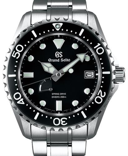 Grand Seiko divers model SBGA2229. Solid stainless steel case and bracelet. Black dial with luminous steel tone markers and hands. Rotating bezel with ceramic 60 minute scale. Sapphire crystal. Seiko caliber 9R65 Spring-Drive movement.