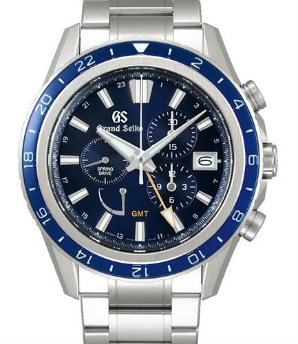 Grand Seiko Evolution 9 Collection Chronograph GMT watch model SBGC249. Created in celebration of the 15th anniversary of the Spring Drive Chronograph. Limited Edition of 700 pieces. Titanium case and bracelet. Powered by Spring Drive chronograph movement. Blue dial with power reserve hand, second-time zone hand, and date calendar.