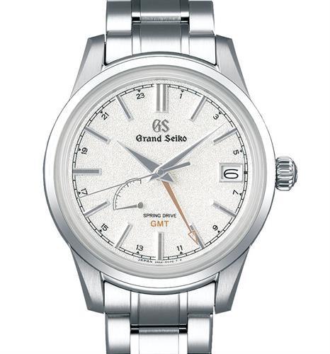 Grand Seiko Elegance ever-changing seasons collection. Toji one of the year`s 24 seasonal phases or sekki. White textured dial with golden GMT hand represent the arrival of winter solstice: air is crisp and clear, snow covers the landscape, last rays of the evening sun in a sky. Model SBGE269. Seiko Spring Drive. All stainless steel case and bracelet. Sapphire crystal Observation back.