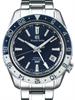 Grand Seiko model SBGJ237. Grand Seiko 9S86 Hi-Beat Automatic movement with GMT(second time zone) and date indicators. Stainless steel case and bracelet with white/blue rotating 24 hour bezel. Blue dial with steel tone hands and markers, filled with LumiBrite for nighttime visibility. Diver rated to 200 meters.