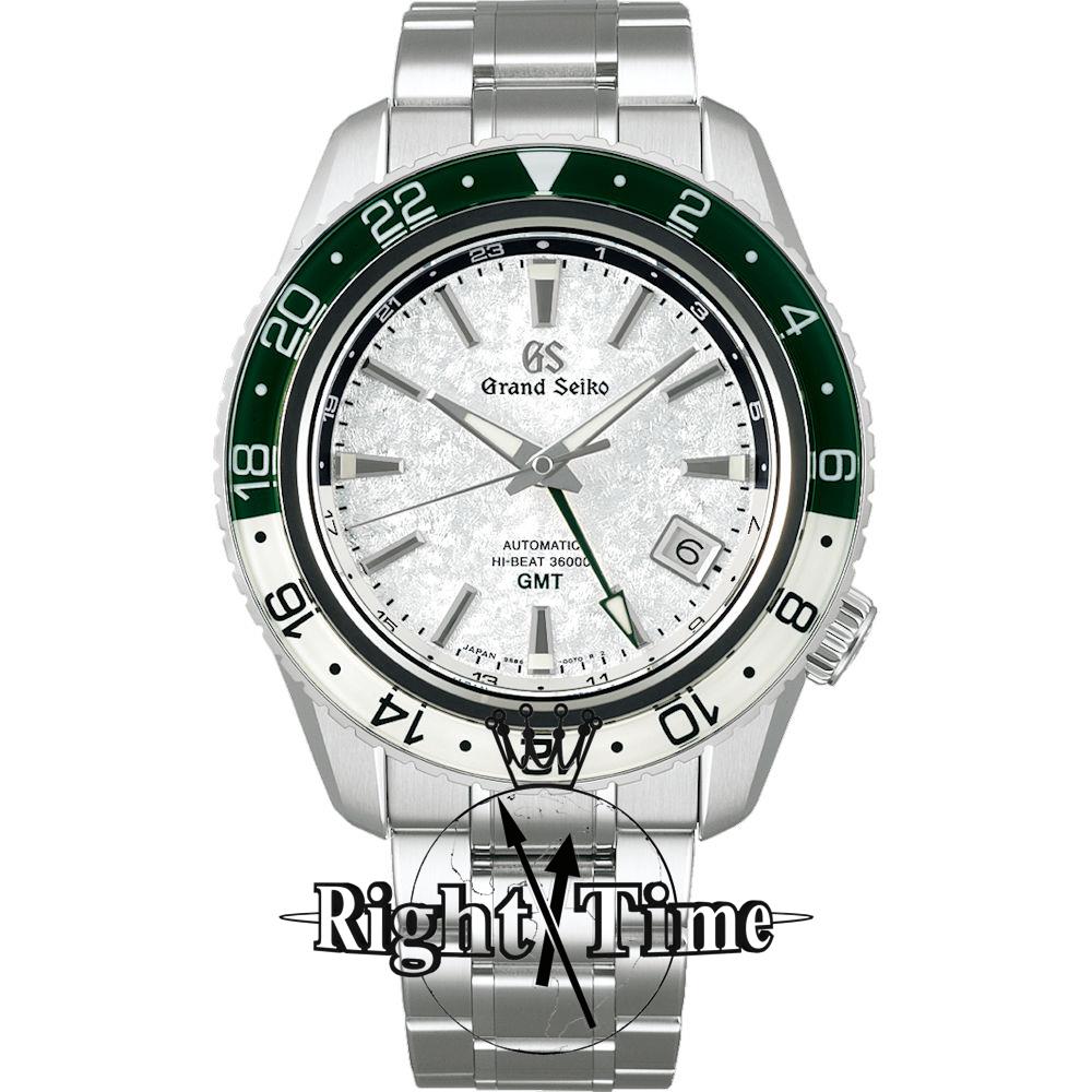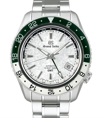 Grand Seiko Mechanical Hi-Beat 36000 GMT model SBGJ277. White "snow valley" dial contrasting with green rotating bezel, echoing the lushness of a summer in mountains. Powered by Hi-Beat Caliber 9S86.
