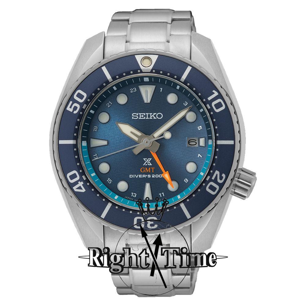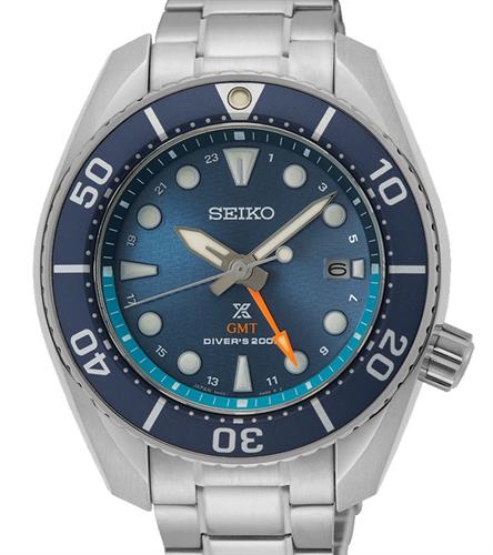 Seiko Prospex Solar "sea" model SFK001. Seiko caliber 5K65 solar movement with date and GMT function. Solid stainless steel case and bracelet. Blue dial with LumiBrite hands and markers. Uni-directional bezel with blue color 60 minute insert. Sapphire crystal. Water resistant to 200 meters.