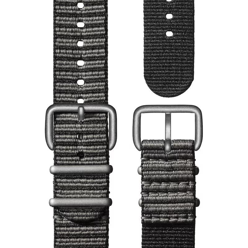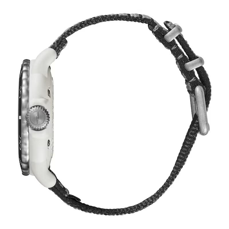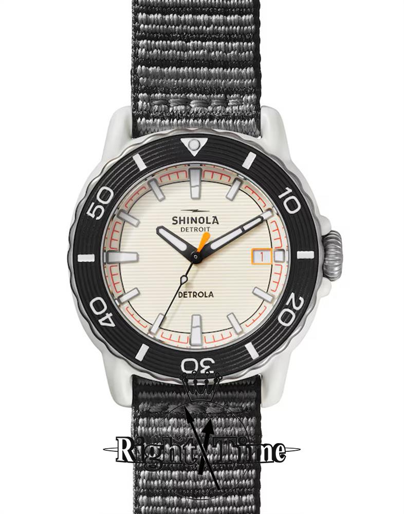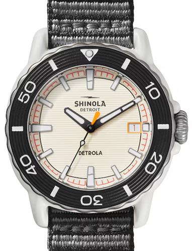 Shinola Detrola Sea Creature model S0120225328. Powered by a Swiss made quartz analog movement. The case and band are crafted from #tide ocean material® granules and yarn, made from 100% ocean-bound plastic waste. Ivory/cream dial with red accents. Mineral glass crystal. Water resistant to 100 meters.