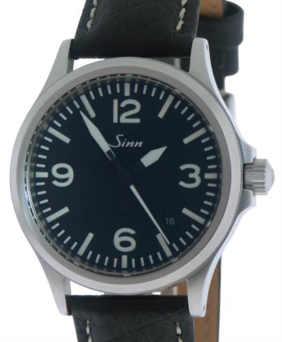 Sinn 656 Pilot model 656.010. Swiss made ETA Caliber 2824-2 automatic movement. Sandblasted stainless steel case. Black dial with luminous hands and markers. Sapphire crystal with A/R coating. Water resistant to 100 meters. Black leather strap with white stitch.