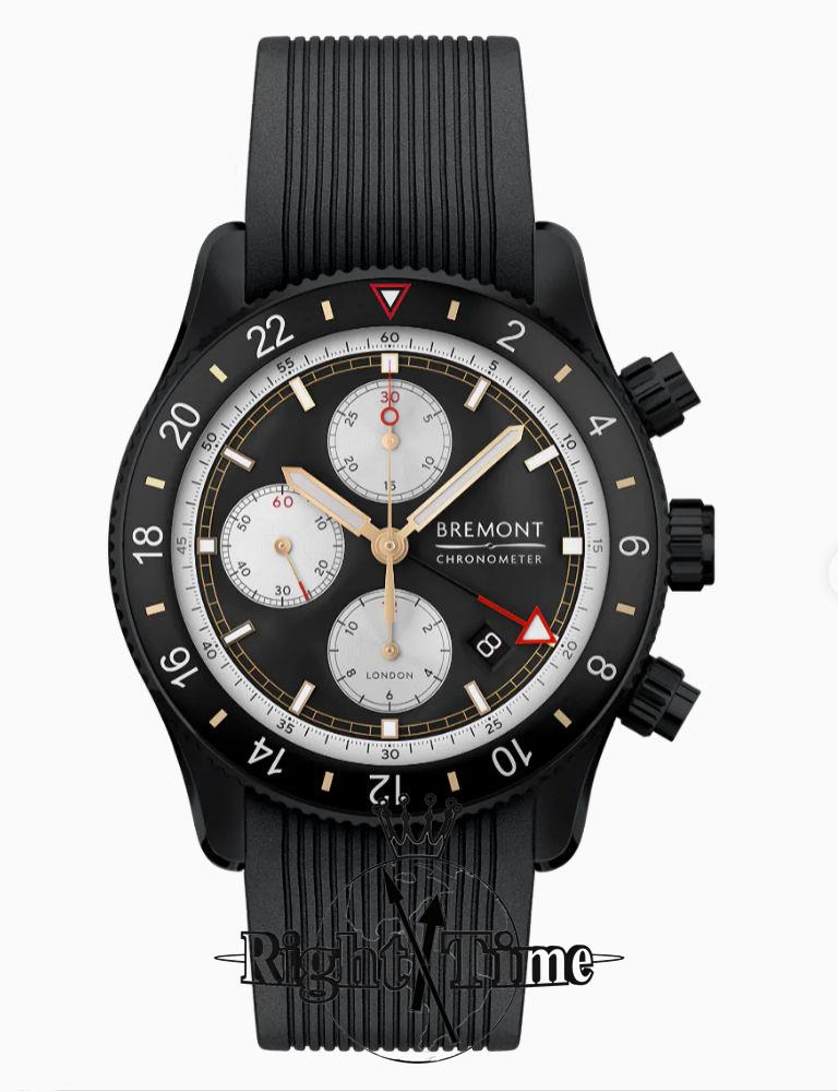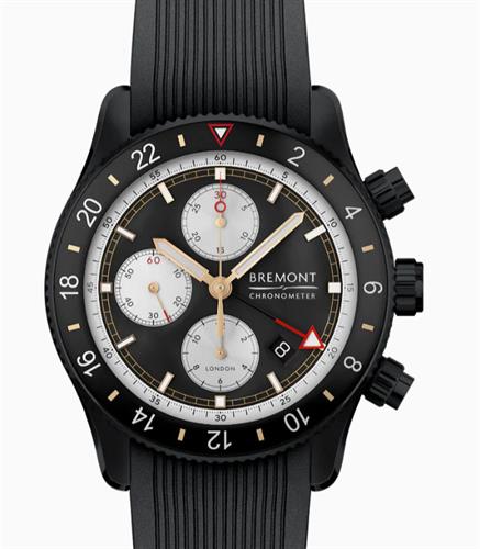 Bremont Supermarine Chrono Model SMARINECHRONO-JET-R-S powered by automatic chronograph movement. Black plated stainless steel case with observation back. Black dial with luminous indexes and second time-zone indicator. 0-24 rotating bezel. Sapphire crystal. Black rubber band. Water resistant to 200 meters