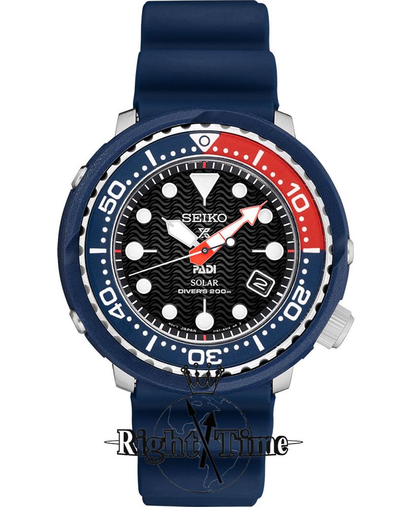 Seiko Prospex model SNE499. Japanese made Caliber V157 solar powered movement. Stainless steel case with blue Tuna can style shroud. Black dial with LumiBrite filled hands and markers. Uni-directional bezel with blue/red (Pepsi) insert. Blue silicone rubber strap.