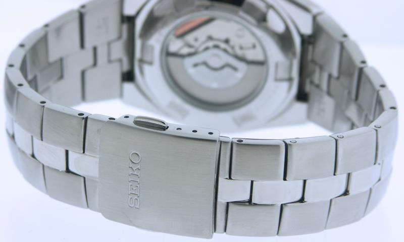 Seiko Arctura Kinetic Chronograph watch model SNL011. Seiko Cal. 7L22 Kinetic Rechargeable Japanese Quartz movement with following functions: date calendar; chronograph; Automatic power generator; Stopwatch measures up to 45 minutes in 1/5 second increments; Energy depletion forewarning function; Overcharge prevention function. Duration of full charge is approximately 5 months. Blue dial, sapphire crystal, steel case and watch bracelet. 100 meters water resistant.