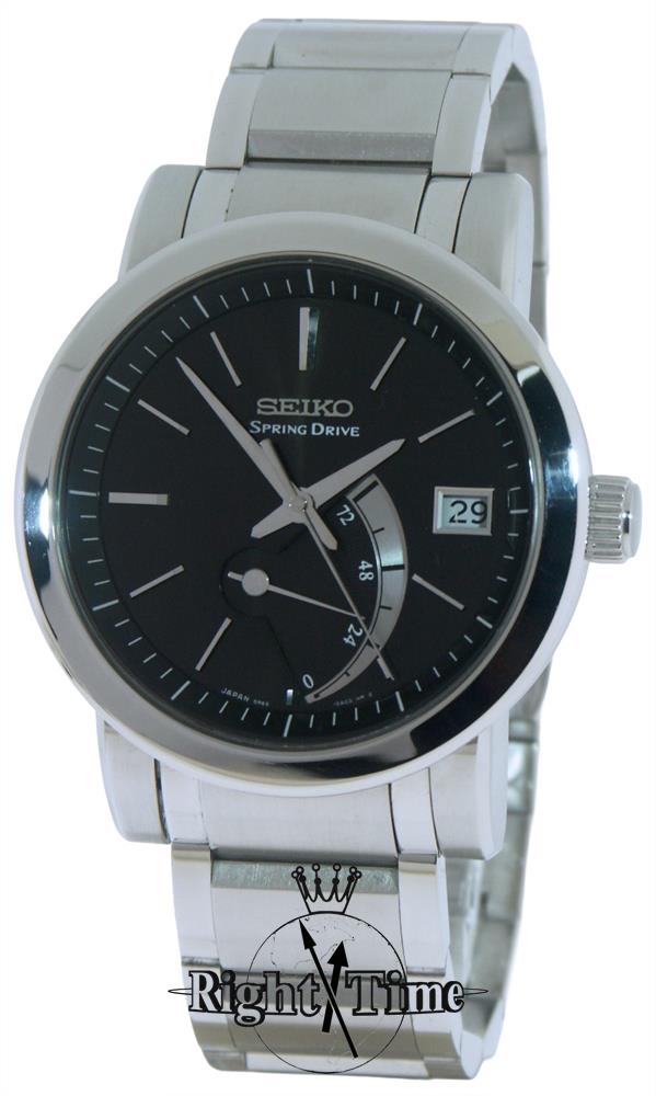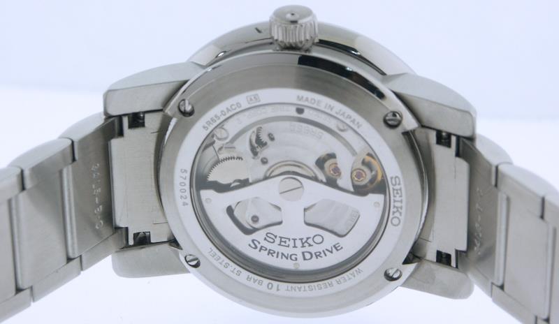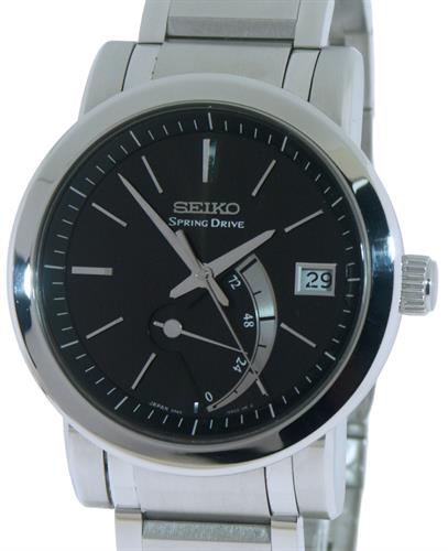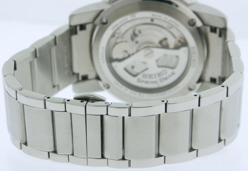 Seiko Spring Drive Caliber 5R65 model SNR005 with power reserve indicator and center second hand. Polished and satin finished stainless steel case and watch bracelet with center opening deployment buckle. Black dial with date calendar and 72 hours power reserve indicator. Skeleton case back. Sapphire crystal. Water resistant to 100 meters.