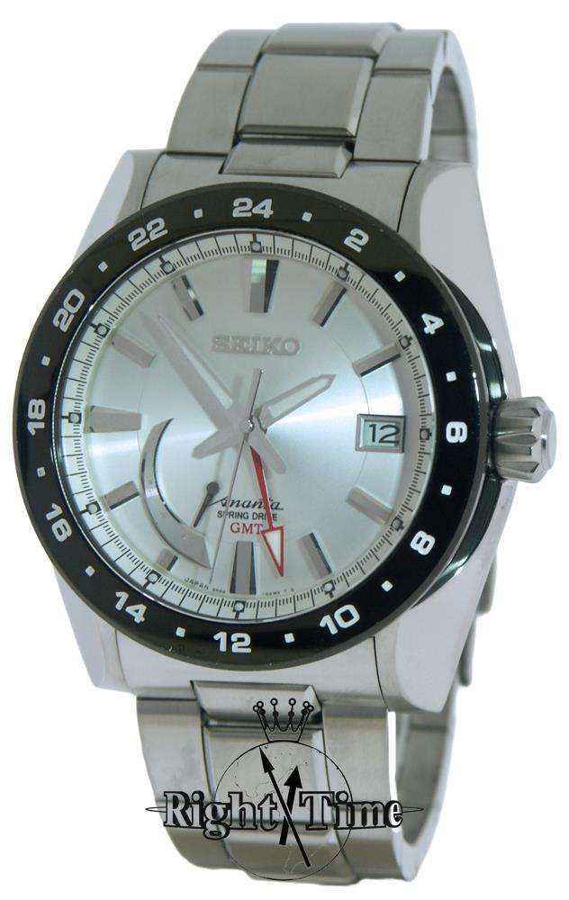 Sold out Seiko Ananta spring drive GMT watch model SNR019 with power reserve indicator powered by Seiko 5R66 spring drive movement with 30 jewels. Stainless steel case with black 24-hours bezel, sapphire crystal, silver color dial, steel bracelet.