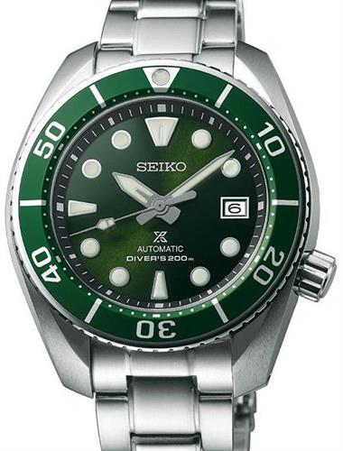 Seiko Prospex "Sumo" factory model SPB103. Sold stainless steel case & bracelet. Seiko Caliber 6R35 Automatic movement. Green dial with luminous hands and markers. Uni-directional rotating bezel with green 0-60 insert. Diver rated to 200 meters water resistant. Sapphire crystal.