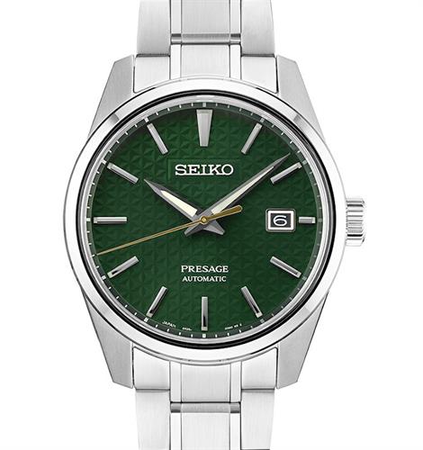 Seiko model SPB169 automatic wrist watch from Seiko Presage Collection. SEIKO Japanese made Automatic movement Caliber 6R35. Stainless steel case, screw-down crown. Textured green color dial with date calendar. Observation back. Steel bracelet. Water resistant to 100 meters.