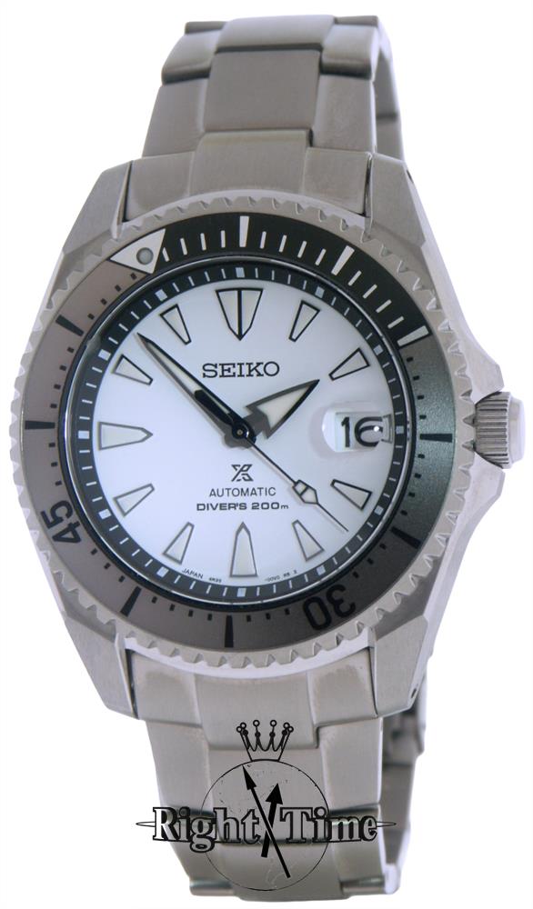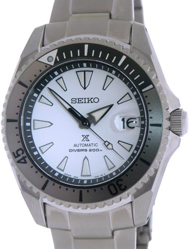Seiko Prospex Shogun Titanium Diver watch model SPB189, but with white dial. Powered by Seiko Calibre 6R35 automatic movement. Titanium case and bracelet. Gray and black 0-60 rotating bezel. White dial with large luminous hands and markers. 200 meters water resistant.