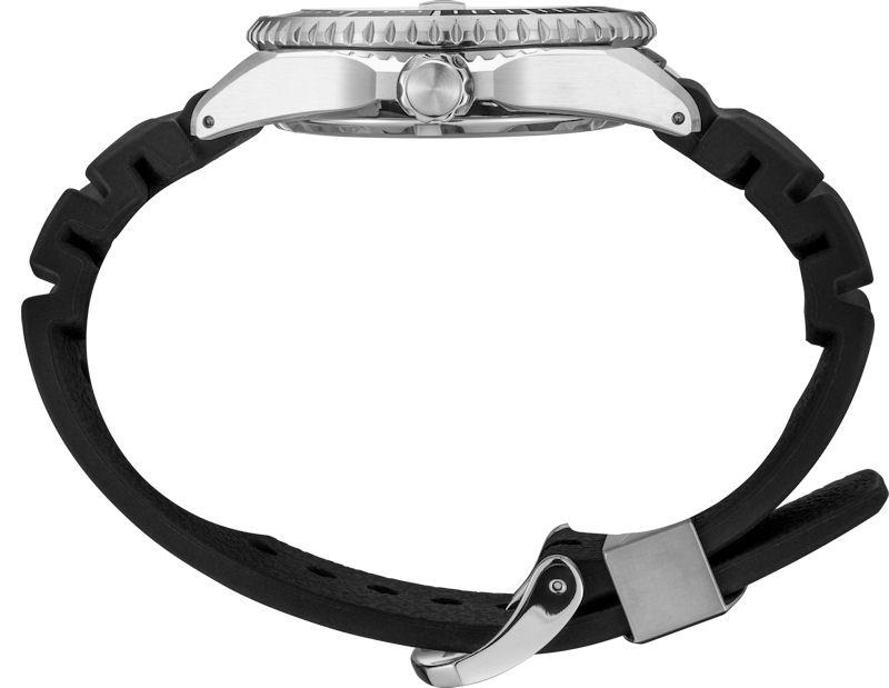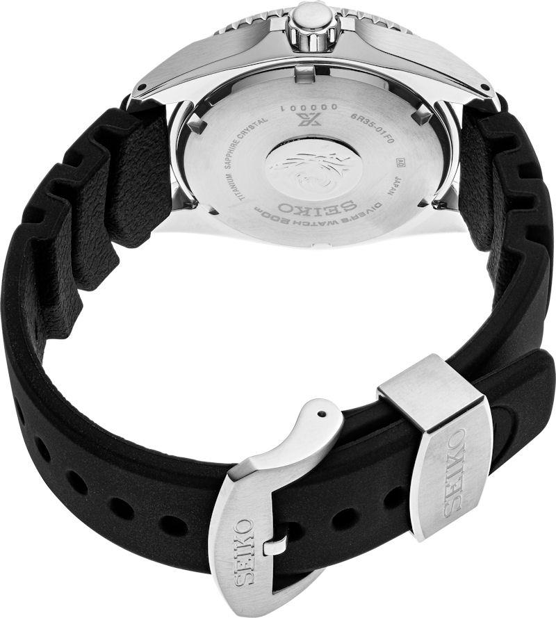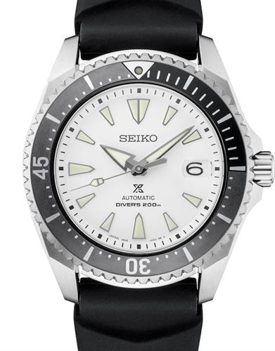 Seiko Luxe Prospex watch model SPB191. Powered by Seiko Calibre 6R35 automatic movement. Titanium case with black rubber band. White dial with date calendar and large luminous hands and markers. 200 meters water resistant.