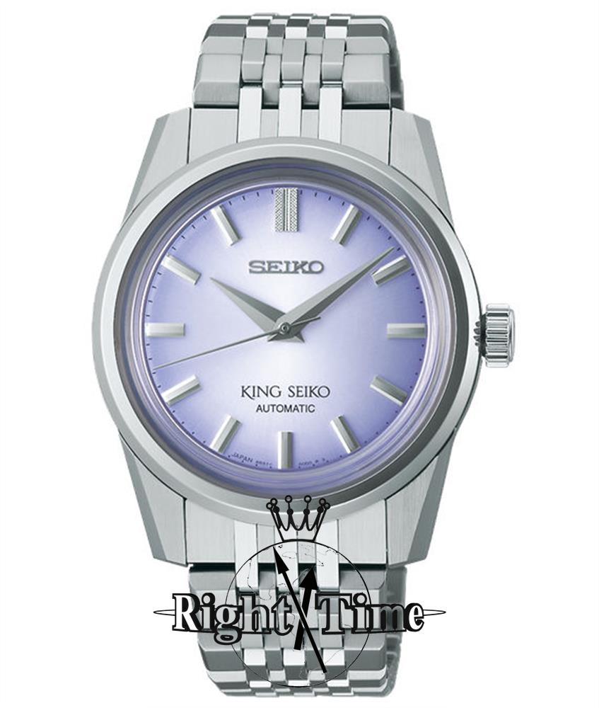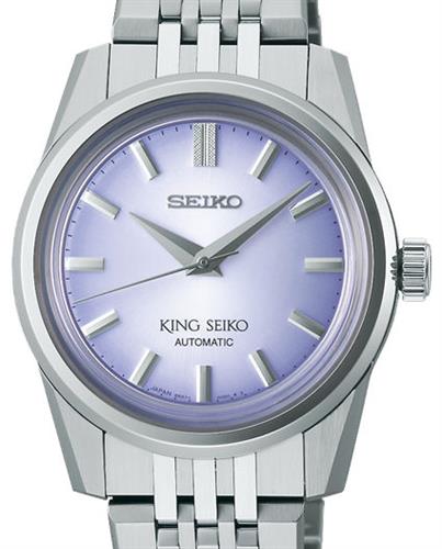 King Seiko model SPB291. Solid stainless steel case and bracelet. Japanese Seiko Caliber 6R31 automatic movement. Metallic purple dial with steel tone hands and markers. Raised sapphire crystal.