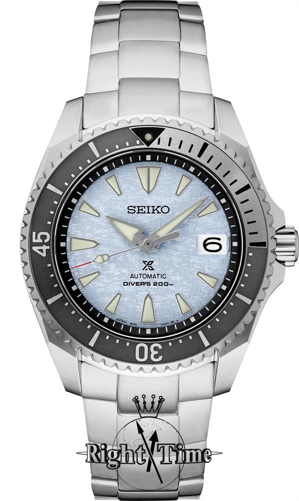 Seiko Prospex Titanium Cave Diver model SPB351. Powered by the Japanese Seiko Caliber 6R35 automatic movement. Solid titanium case and bracelet. Textured light blue color dial with luminous hands and markers. Uni-directional rotating bezel with black and gray 60 minute insert. Sapphire crystal with date magnifier. Diver rated to 200 meters water resistant.