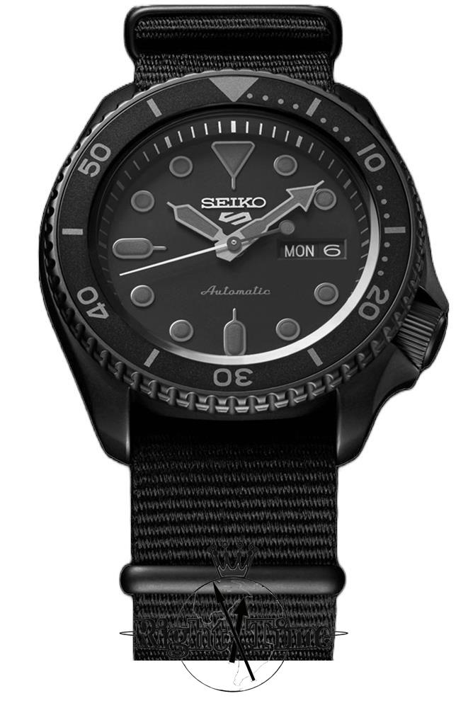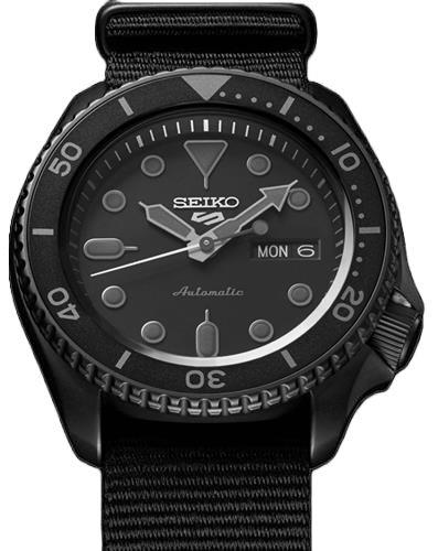 Seiko 5 SRPD79 sport street style wrist watch 100m water resistant, powered by SEIKO 24 jewels 4R36A Japanese Automatic movement with Day/Date calendar. Black PVD coated stainless steel case with uni-directional rotating black insert 0-60 bezel. Black color dial with black Lumibrite hands and markers. Black NATO style nylon strap.