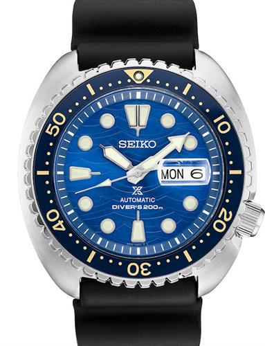 Seiko Prospex model srpe07. Seiko solid stainless steel "King Turtle" case. Japanese automatic movement. Blue dial with luminous hands and markers. Ratcheted rotating bezel. Dive rated to 200 meters water resistant.