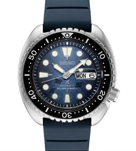 Seiko Prospex King Turtle Manta Ray Special Edition watch model SRPF77. Powered by Seiko automatic movement. Stainless steel "turtle" style case with blue rubber strap. Blue dial with inspired by the turtle shell texture, large luminous hands and markers. 200 meters water resistant.
