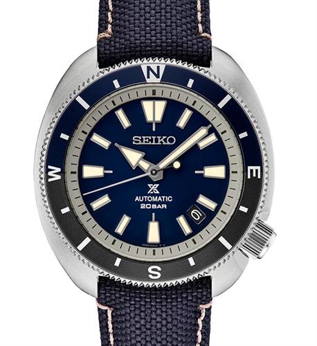 Seiko model SRPG15 from the Prospex collection. Japanese automatic Seiko caliber 4R35. Stainless steel "turtle" case with blue/black compass bezel and blue nylon band. Blue dial with luminous hands and markers.