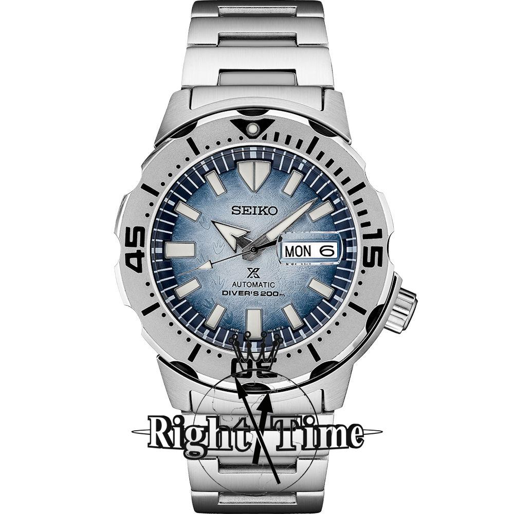 Seiko Prospex model SRPG57, special edition "Save the Ocean". Seiko solid stainless steel case. Japanese automatic movement in caliber 4R36. "Frost" textured blued dial with luminous hands and markers. Ratcheted rotating bezel. Dive rated to 200 meters water resistant.