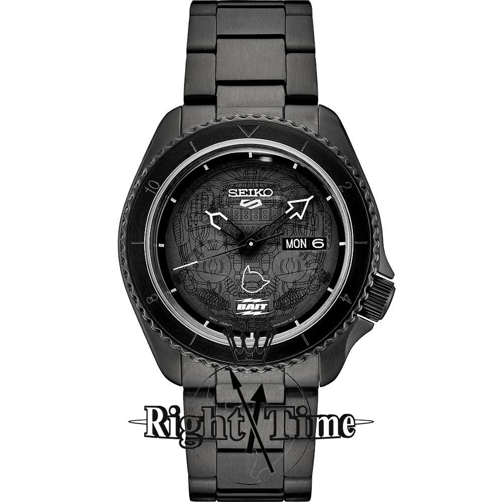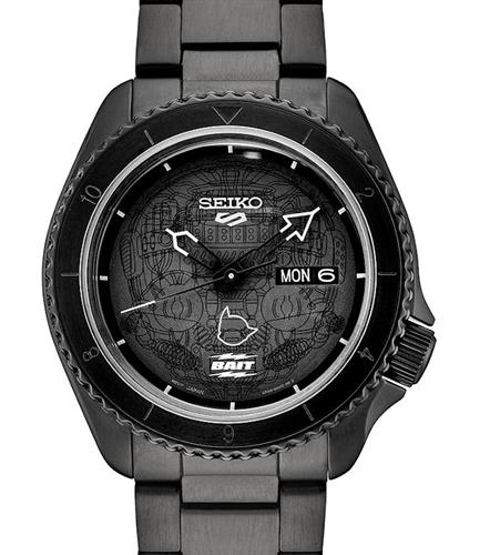 Seiko 5 SRPH45 BAIT wrist watch. Limited edition of 2,000 pieces. 100m water resistant, powered by SEIKO 24 jewels 4R36 Japanese Automatic movement with Day/Date calendar. Black PVD plated stainless steel case with rotating 12-hours bezel and steel bracelet. Black dial with Seiko and BAIT logo.