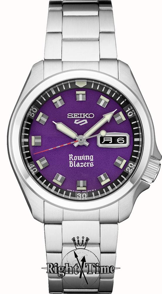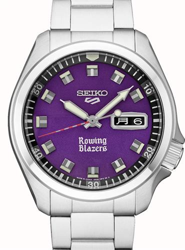 Seiko 5 SRPJ65 Rowing Blazers sport wrist watch 100m water resistant, powered by SEIKO 24 jewels 4R36 Japanese Automatic movement with Day/Date calendar. Stainless steel case. Comes on a steel bracelet with an additional nylon strap. Purple color dial with LumiBrite hands and markers. Limited Edition of 888 pieces