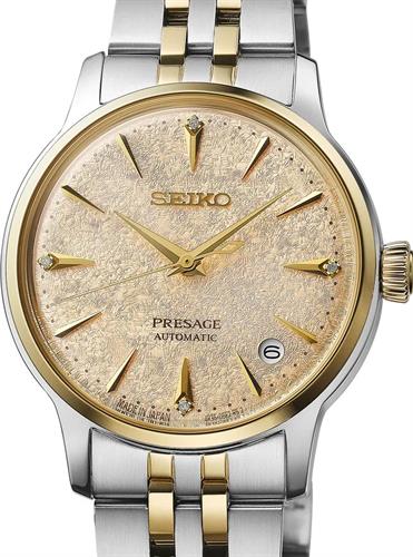 Seiko Presage cocktail time model SRPL64. Stainless steel case and bracelet with gold tone PVD accents. Textured champagne color textured dial. Domed mineral glass crystal. Seiko Cal 4R35 automatic movement with date.