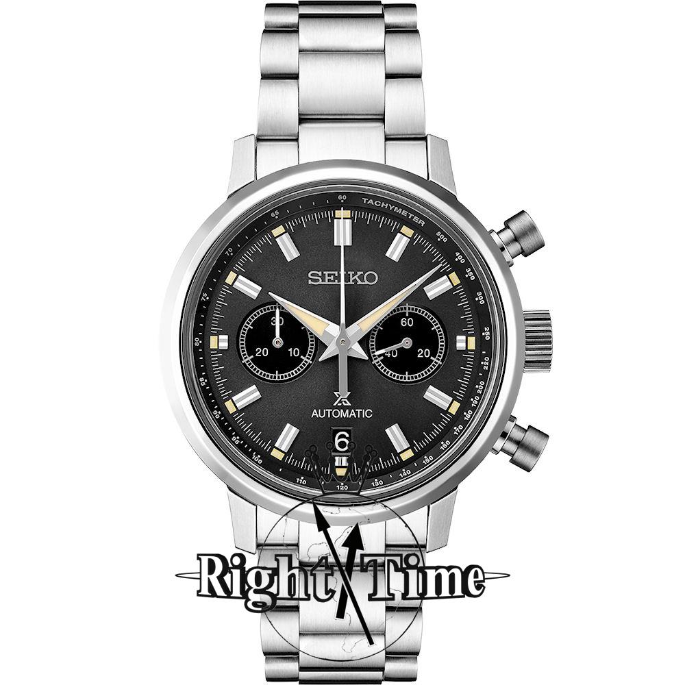 Seiko Prospex SpeedTimer watch model SRQ037 powered by automatic chronograph movement with manual winding mechanism. Stainless steel case and bracelet. Grey color dial with tachymeter scale and Arabic numerals. Water resistant to 100 meters.