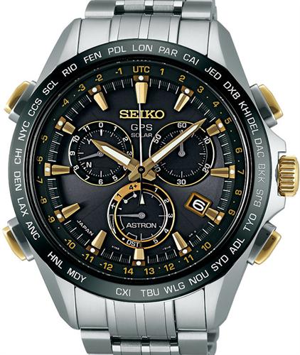 Seiko Astron GPS Solar chronograph watch model SSE007. The World`s First GPS Solar Watch. Understands all the 40 official time zones. Accurate time, anywhere on earth. Convenient, simple and elegant. Black dial and bezel. Gold tone accents. Titanium case and bracelet.