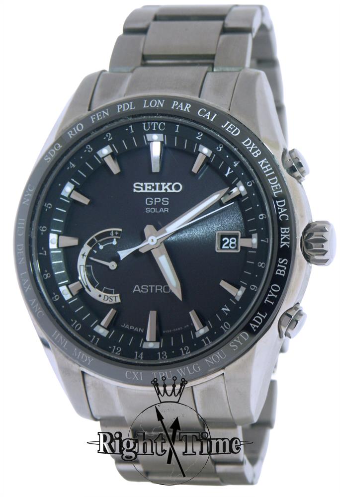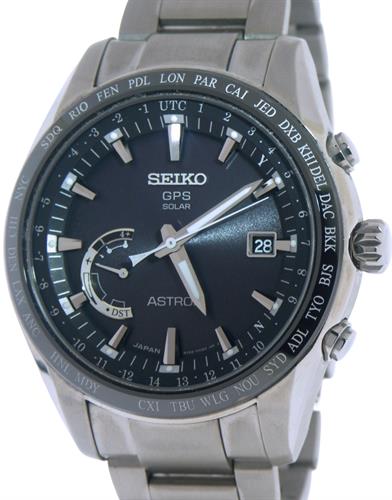 Seiko Astron GPS Solar World Time watch. Understands all the 40 official time zones. Accurate time, anywhere on earth. Perpetual day/date calendar. Convenient, simple and elegant. Daylight savings and power saving functions. Black dial. Titanium case and bracelet. Black ceramic bezel. Sapphire crystal.
