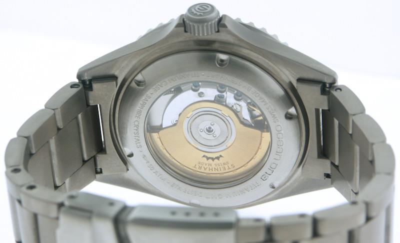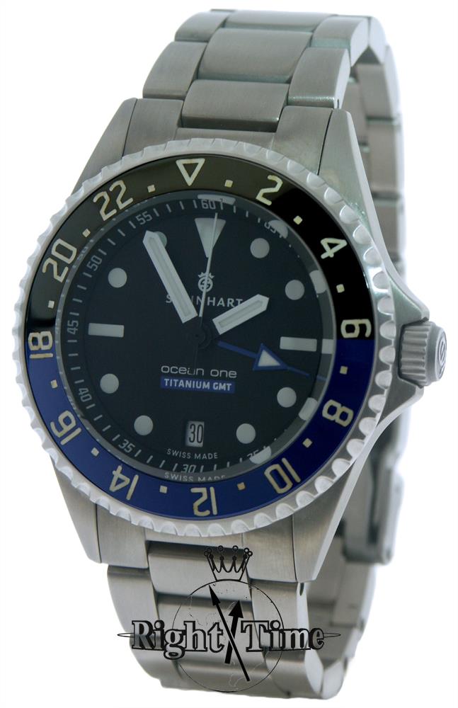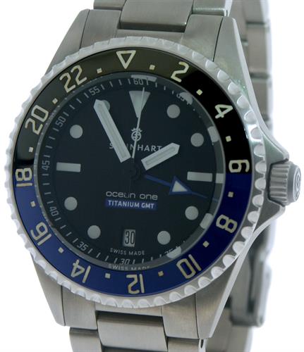 Steinhart Ocean One model 103-0662. Titanium case and bracelet. Uni-directional bezel with black/blue ceramic 24 hour insert. Original Swiss made ETA 2893-2 automatic movement with date and GMT functions. Black dial with BGW 9 super luminova filled hands and markers. Water resistant to 50 ATM.