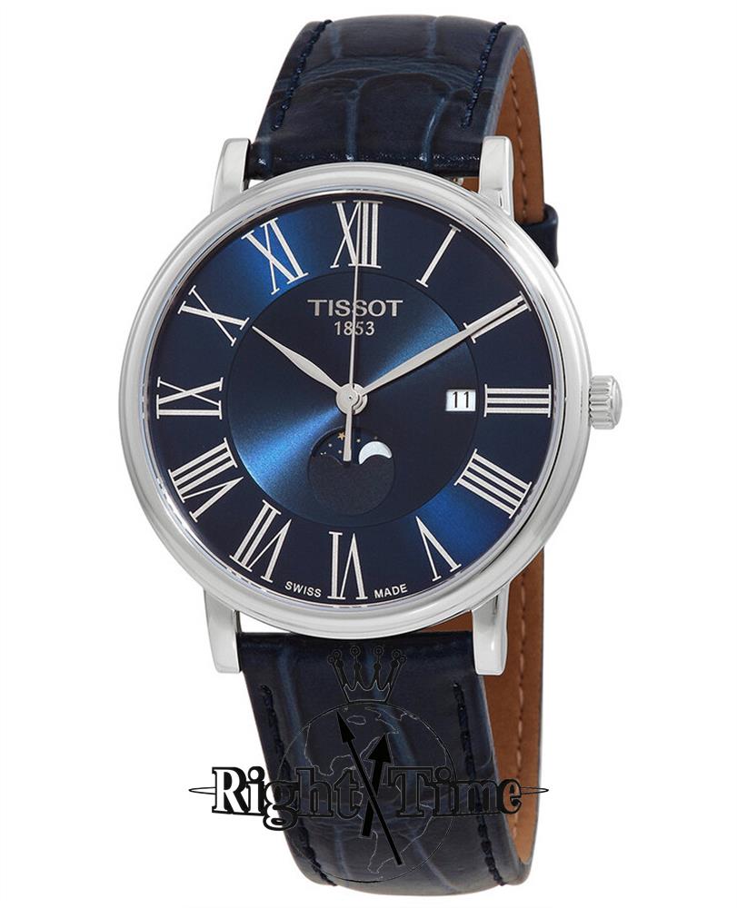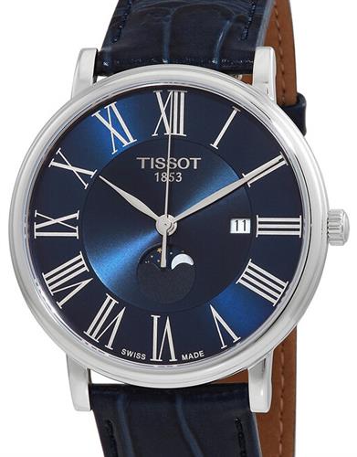 Tissot Carson Premium model T122.423.16.043.00. Swiss quartz analog movement. Polished stainless steel case. Blue dial with printed Roman numerals. Sapphire crystal. Blue alligator textured leather strap.