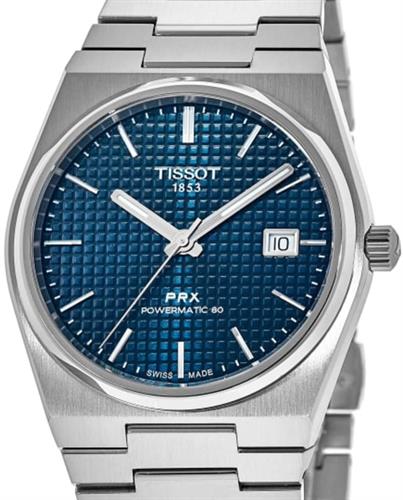 Tissot PRX Powermatic 80 model T137.207.11.041.00. Swiss made automatic movement with date function and up to 80 hour power reserve. Solid stainless steel case and bracelet with a unique tonneau shape. Waffle pattern dial in a stunning ice blue color. Sapphire crystal. Water resistant to 100 meters.