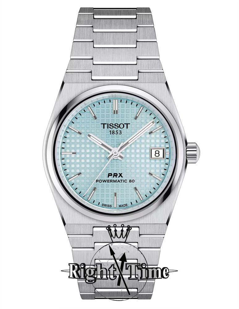 Tissot PRX Powermatic 80 model T137.207.11.351.00. Swiss made automatic movement with date function and up to 80 hour power reserve. Solid stainless steel case and bracelet with a unique tonneau shape. Waffle pattern dial in a stunning ice blue color. Sapphire crystal. Water resistant to 100 meters.