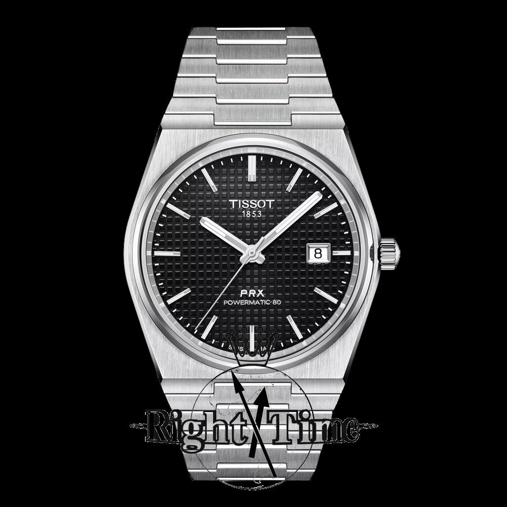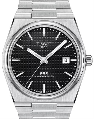Tissot PRX Powermatic 80 model T137.407.11.051.00. Solid stainless steel case and bracelet. Textured black dial with luminous hands and markers. Sapphire crystal. Swiss made Tissot Powermatic automatic movement with 80 hour power reserve.