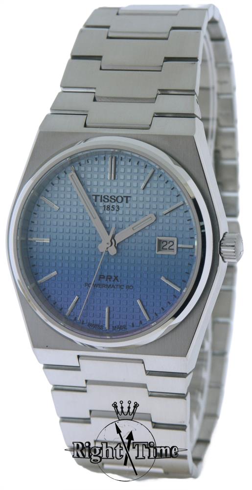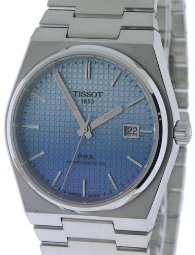 Tissot PRX Powermatic 80 model T137.407.11.351.01. Swiss made automatic movement with date function and up to 80 hour power reserve. Solid stainless steel case and bracelet with a unique tonneau shape. Waffle pattern dial in a stunning gradient ice blue color. Sapphire crystal. Water resistant to 100 meters.