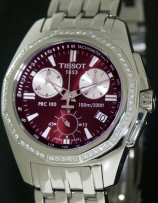 Tissot ladies quartz sport-dress chronograph model T22.1.486.81 with gorgeous deep burgundy color dial and silver sub-dials, diamond studded bezel, 100m water resistance, polished stainless steel case and bracelet