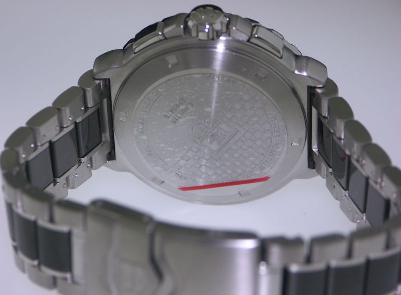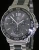 Tag Heuer Formula 1 series, factory model CAU1115. Powered by a Swiss Quartz analog chronograph movement. Stainless steel case and bracelet with black ceramic center links. Beautiful Anthracite Sunray dial with black sub-dials. Fixed black ceramic bezel with tachymeter scale.
