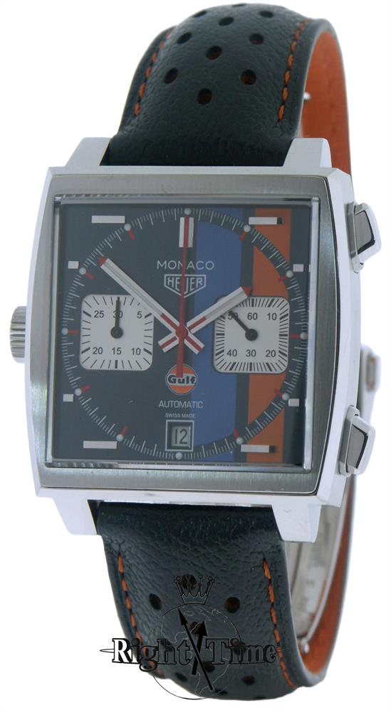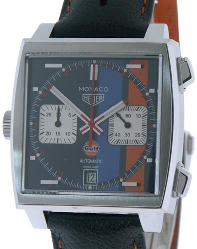 Tag Heuer `Monaco Gulf Racing` edition automatic chronograph model CAW211R.FC6401 housed in 39mm stainless steel case on blue/orange factory leather strap with deployant clasp