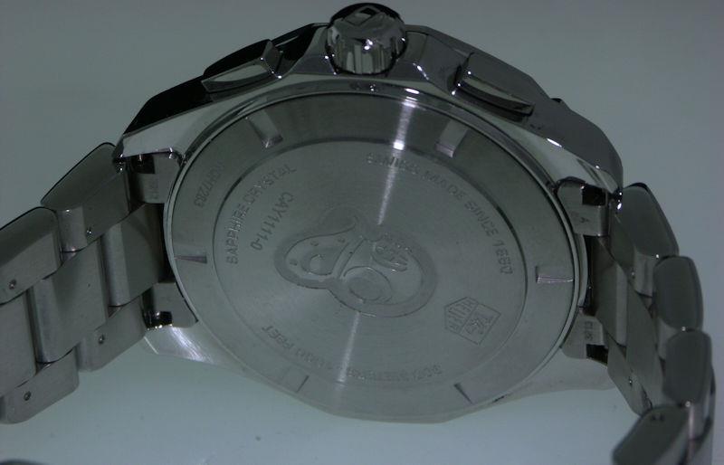Tag Heuer Aquaracer series factory model CAY1111.BA0927. Swiss made Ronda Quartz Chronograph movement with big-date feature at 12 o`clock. All stainless steel case & bracelet including uni-directional 60 minute bezel. Silver dial and sub dials under a scratch resistant sapphire crystal. Water resistant to 300 meters.