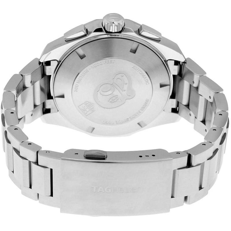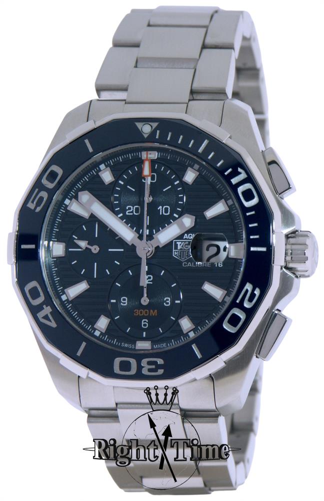 Tag Heuer Aquaracer model CAY211B.BA0927. Swiss made Tag Heuer Caliber 16 automatic movement with date and chronograph functions. Solid stainless steel case and bracelet. Uni-directional bezel with blue ceramic 60 minute insert. Horizontal textured blue dial with steel tone hands and markers. Sapphire crystal with bubble magnifier. Water resistant to 300 meters.