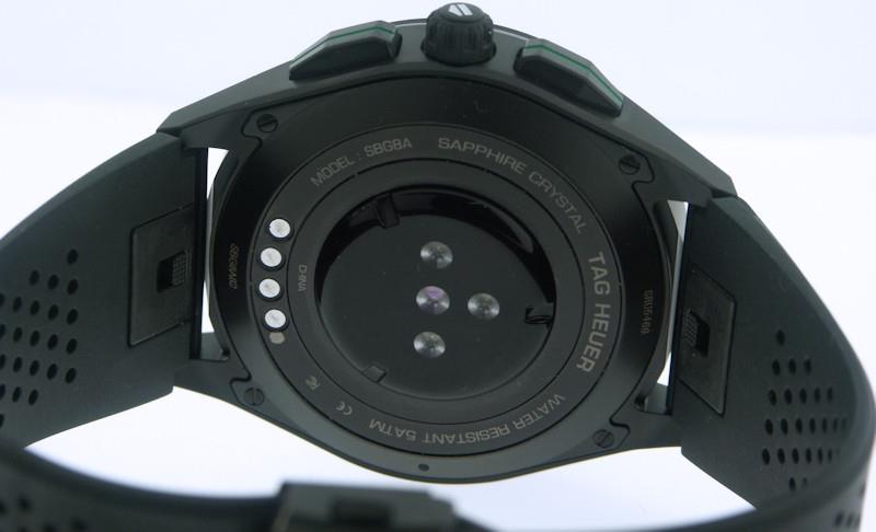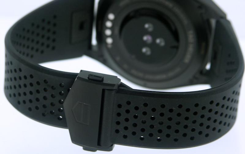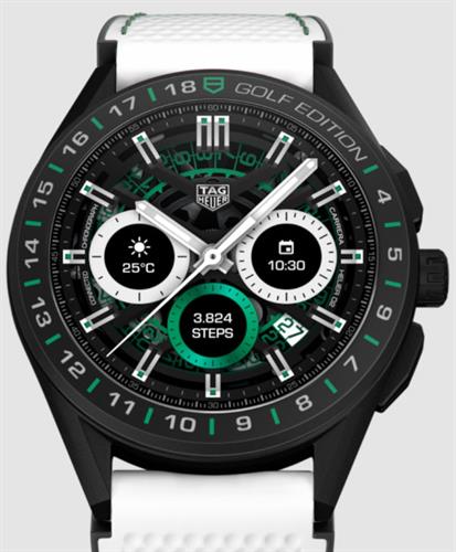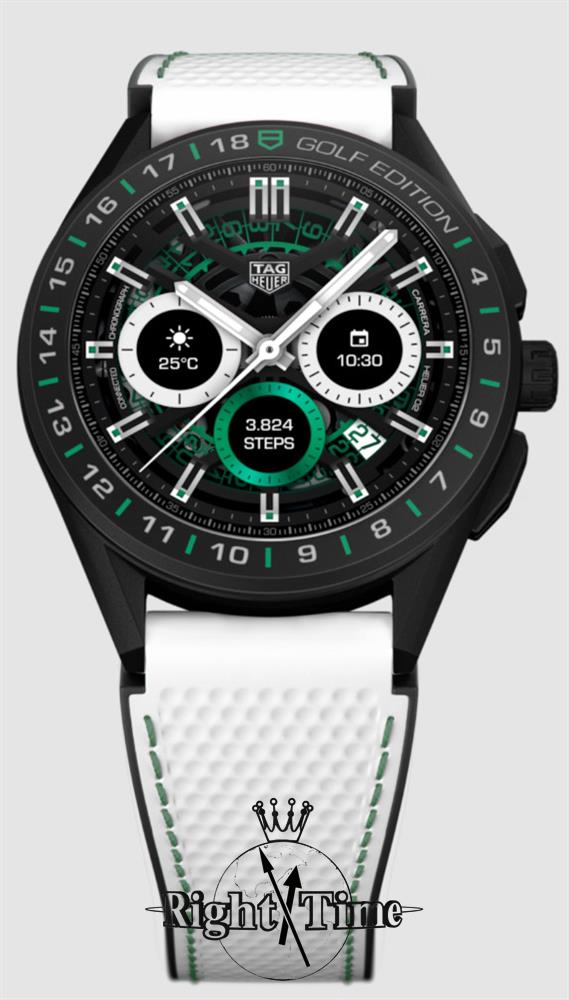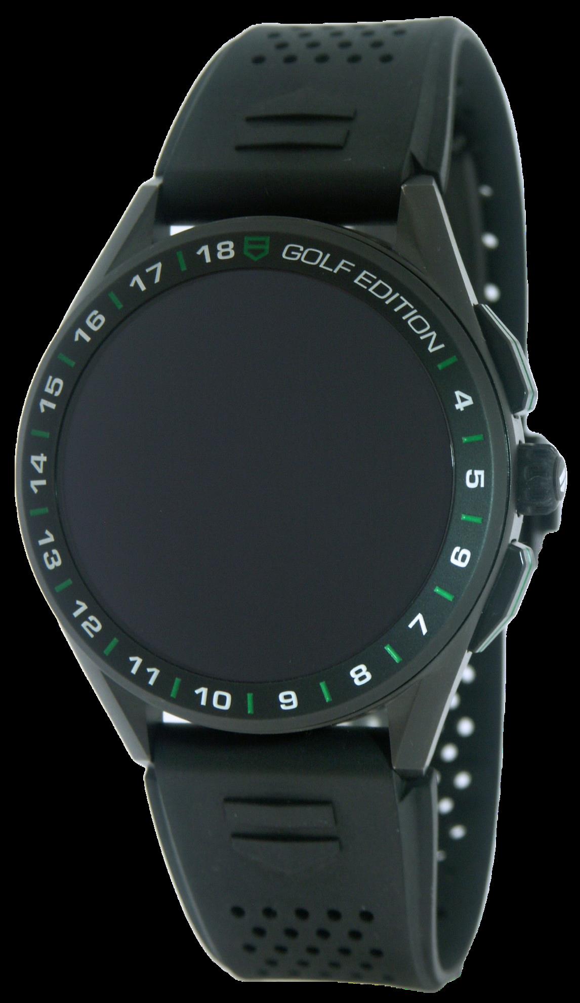 Tag Heuer Connected Golf Edition model SBG8A82.EB0206. Black matte titanium case with ceramic bezel. Touchscreen sapphire crystal. Digital display. Powered by the the Google Wear OS operating system. Water resistant to 50 meters. Comes in a set with black and white rubber straps.