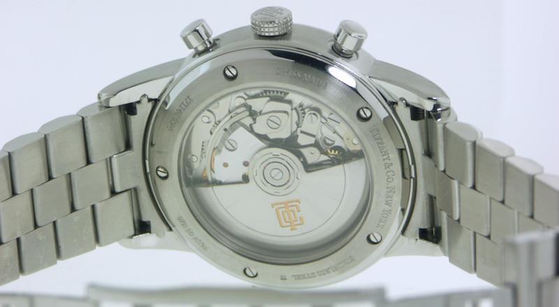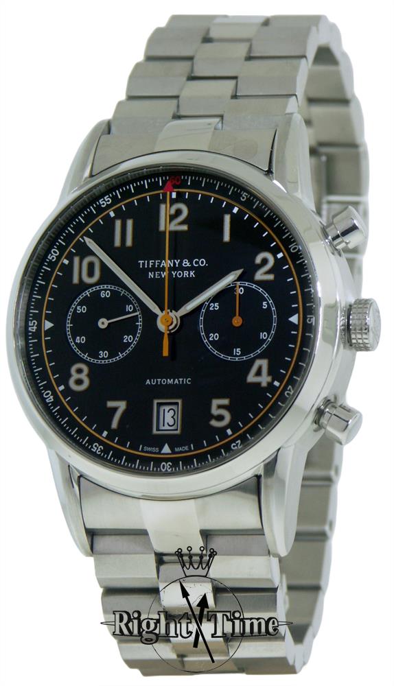 Swiss made automatic chronograph model CT60 from the Tiffany and Co. 41mm stainless steel case and bracelet, black easy to read Arabic dial, powered by Sellita SW500 movement