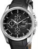 Tissot Couturier collection. Swiss made automatic chronograph ETA Caliber C01.211. Sold stainless steel case with unique contrasting grooves. Sapphire crystal. Black dial with steel tone markers and hands. Custom fitted contoured black leather strap with an alligator grain texture, and a push-button deployant buckle.