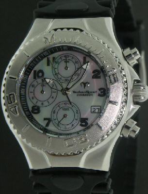 Unisex Technomarine sport quartz chronograph with pink/blue mother-of-pearl dial with jelly and leather (2) hands.