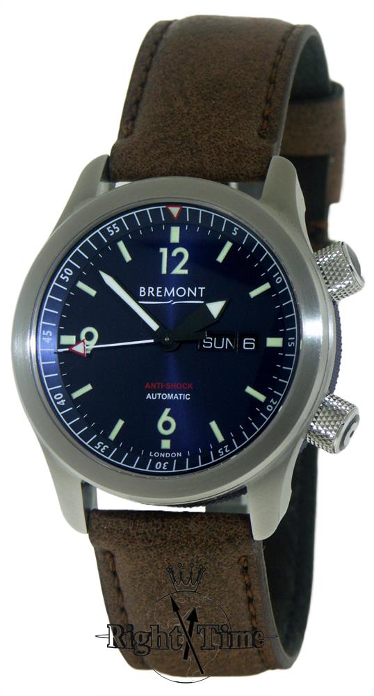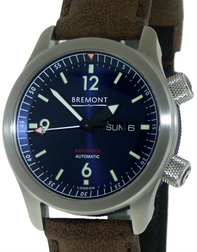 Bremont Military U-2-BL automatic model featuring hardened stainless steel case with deep blue dial and inner rotating bezel operated by crown at 2