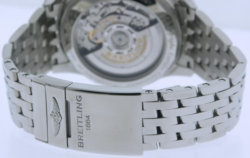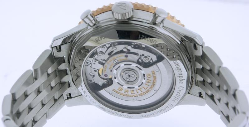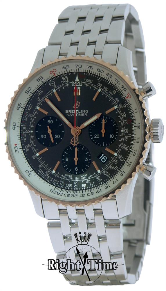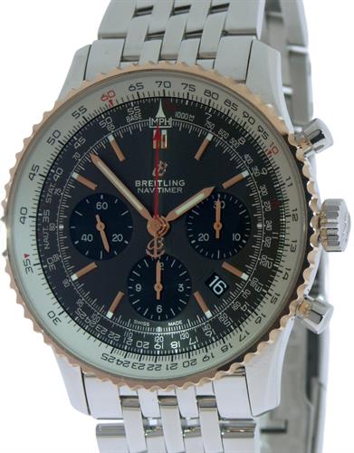 Classic Breitling Navitimer 01 model UB0121211F1A1. Swiss made automatic Breitling manufactured Caliber 01 chronograph movement, gray dial with rose gold applied markers and luminous hands. Highly polished stainless steel 43mm case and bracelet with 18kt solid rose gold rotating bezel with slide ruler.