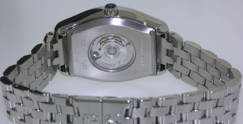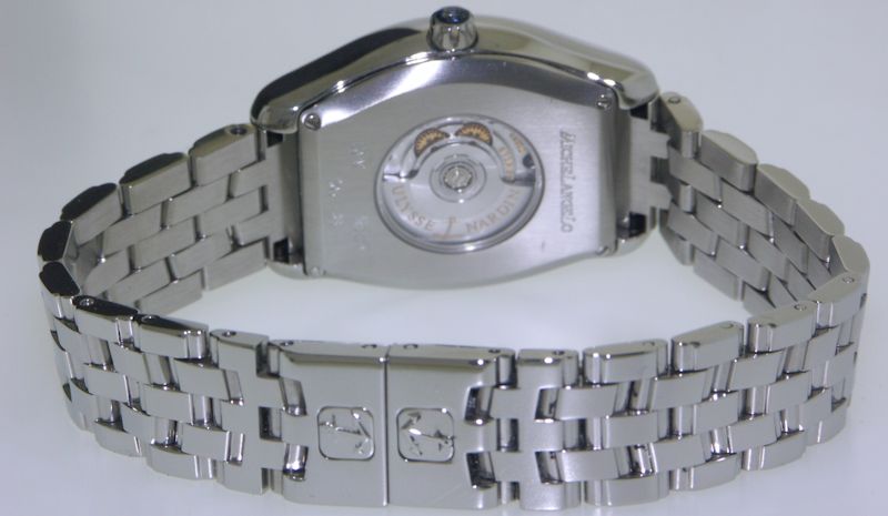 Ulysee Nardin MICHELANGELO ladies auto-quartz model in all polished stainless steel case and band with Royal blue Arabic dial